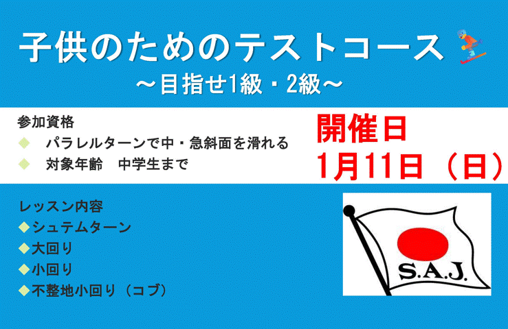 1級2級の受験対策コースです。受験者に応じて検定時の注意点等、検定合格に向けての課題を明確させていただきます。検定種目に応じた滑りのアドバイスをさせていただきます。